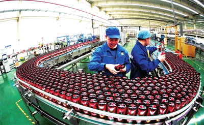 2月10日,湖北奥瑞金包装有限公司员工在现代化生产线上加班生产饮料。