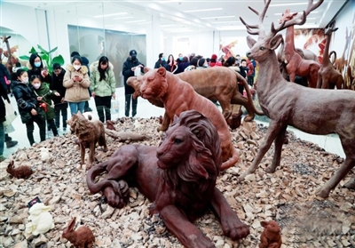 近日,在上海首家巧克力博物馆,英俊的马匹、憨厚的大象、威风的老虎,游客仿佛置身于动物世界。栩栩如生的巧克力动物雕塑,精美的艺术品都是由巧克力制作而成,吸引众多游客前来甜蜜打卡。