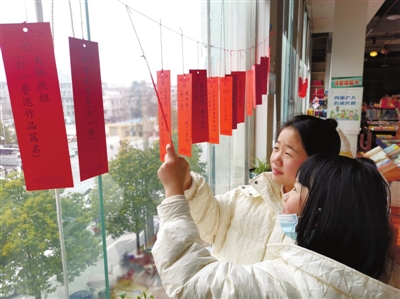 2月14日,两名学生在市新华书店猜谜。为迎接元宵佳节,市新华书店店内悬挂起百余条谜语,让读者感受传统文化的独特魅力,度过一个文明和谐的元宵佳节。