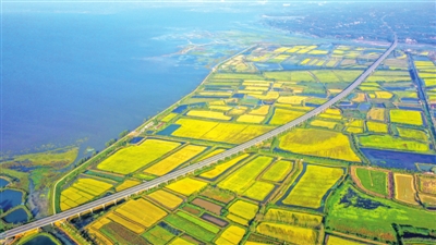 无人机航拍下的向阳湖镇八字口,汽车飞驰在蕲嘉高速上。高速两旁,金灿灿的稻田与一湖碧水的斧头湖交相辉映,构成了一幅乡村振兴美丽画卷。 通讯员 李小强 摄