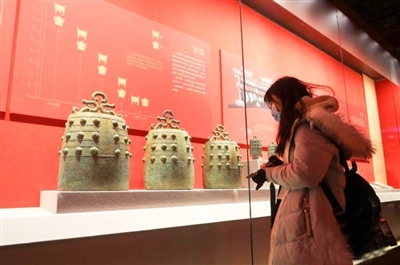 近日,2022北京新闻中心联合故宫博物院举办“2022北京新闻中心媒体开放日”活动,邀请百余位中外记者探访故宫,观赏故宫开年大展——“何以中国”。图为一名记者在“何以中国”展览上参观“蟠螭纹编镈”。