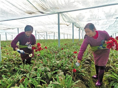 在三桥村星辉花卉有限公司,沟渠交错、一字排开的260亩连栋大棚基地里,80余村民正乐呵呵地在大棚采花、打叶、做包装,搅热了田野春潮。