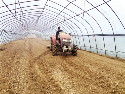 在杨堡村,300亩大棚基地里传来轰鸣的旋耕机翻地声,姜老板吴海兵正在指导旋耕机手,为三月份栽姜苗做好准备。