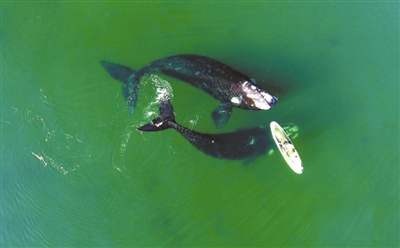 近日,阿根廷马德林港海岸,鲸鱼用它的一只鳍轻轻地向前推桨板。Maximiliano Jonas用无人机拍摄了这些惊人的画面,南方露脊鲸在他的朋友Analia Giorgetti的船只附近徘徊。