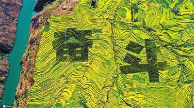 近日,贵州省盘州市新民镇14万余亩油菜花竞相绽放,在核心区的上乍勒村和下乍勒村一带的梯田里,当地村民用不同品种和颜色的油菜,种植出巨幅“奋斗”字样和反映农耕文化的图案。