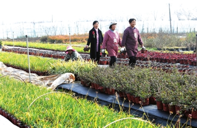 2月28日,嘉鱼县潘家湾镇四邑村杭嘉花卉苗木种植合作社基地,村民在移栽花卉苗。