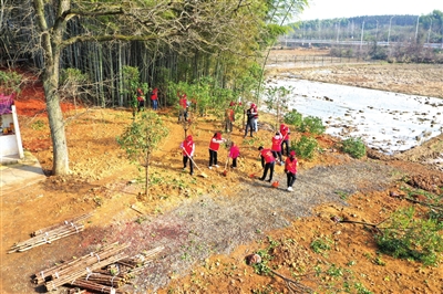 植桂添香,绿满咸安。3月7日,在官埠桥镇张公庙村11组山枣陈村湾、石子岭村13组,房前屋后,红旗飘扬,以咸安区林业局志愿服务队牵头,官埠桥镇多支志愿队配合的义务“植桂添香”活动正火热进行,200余名志愿者三五成群围成一组,或扶桂花树,或挥锹铲土,或踩土压实,一株株桂花树站列成行,2公里环形乡村道路顿成亮丽的风景。