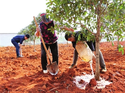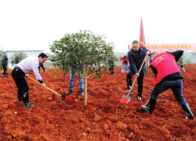 张公庙山枣陈村湾村民70岁的陈老爹一边栽树一边乐呵呵地说:“党的政策真好,免费给村里栽这么大的桂花树,今年秋天就可以在家门口赏花闻香了。”