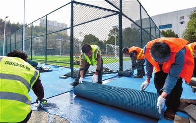 3月4日,赤壁市人民广场升级改造项目现场,工人正在铺设橡胶跑道。为更好满足群众休闲健身需求,赤壁市斥资300多万元对人民广场东侧区域进行升级改造,改造面积8800多平方米,新增篮球、足球、羽毛球等3处运动场地。 咸宁日报全媒体记者 夏正锋 摄