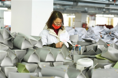 3月18日,嘉鱼县鱼岳镇工业园内的湖北博纳箱包有限公司生产车间,工人在检查箱包做工情况。