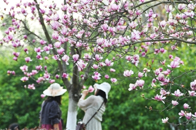 3月13日,市人民广场,玉兰花开得正艳,市民驻足观赏。连日来,气温回暖,桃红柳绿,玉兰怒放,一派浓浓的春意。