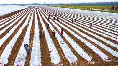 3月23日,在湖北金润农业嘉鱼平安州7250亩蔬菜基地上,春包绿油油,农民们用铁丝挑出保温薄膜下面水果玉米苗,展现一幅人勤春早的美丽画图。 湖北金润农业发展有限公司位于嘉鱼县潘家湾镇,是湖北省农业产业化重点龙头企业,年蔬菜交易量50万吨,带动就业3000人。