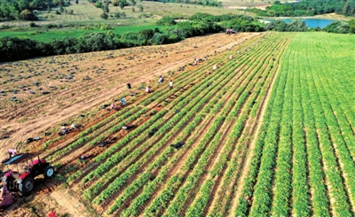 3月28日,工人在文昌市昌洒镇田间采收地瓜(无人机照片)。