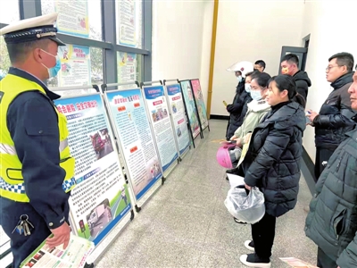 随后,通过讲解交通安全展板及播放交通安全警示视频,图文并茂地向现场人员解析典型交通事故案例,耐心细致地阐述了安装遮阳伞(雨篷)、不戴安全头盔的危害性和具体处罚措施,呼吁群众自觉抵制各类交通违法行为,提升自我交通安全意识,自觉遵守交通法律法规。