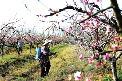 3月29日,嘉鱼县新街镇嘉多宝生态果蔬种植园内,果农正在为桃树喷洒保花保果药剂。