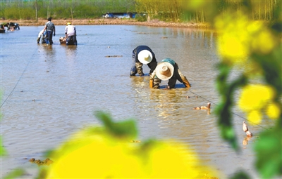 4月1日,赤壁市柳山湖镇腊里山村,当地藕农正在种植莲藕。据了解,今年,该镇农机专业服务合作社流转土地580余亩种植莲藕,预计亩产量可达到1500公斤。目前大规模种植已全面铺开,预计8月份可上市。 咸宁日报全媒体记者 夏正锋 摄
