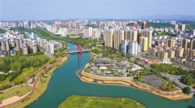 4月11日,无人机拍摄的温泉城区淦河两岸,高楼林立,尽显现代都市繁华。