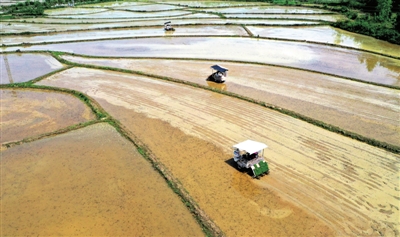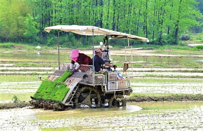 4月25日,赤壁市茶庵岭镇罗丰村,几台插秧机正在机插早稻。据了解,该镇水稻种植面积30000余亩,其中早稻面积5900余亩。目前,早稻播种已近尾声。