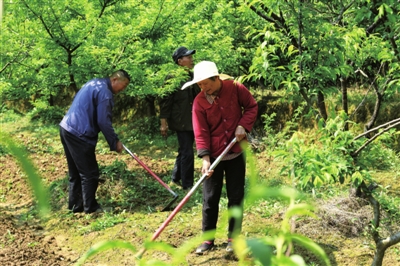 4月26日,嘉鱼县高铁岭镇九龙村北南山果园,村民在桃园进行果园管理。