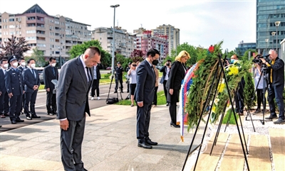 5月8日,塞尔维亚内务部长武林(前左),劳动、就业、退伍军人与社会事务部长泰帕夫切维奇(前右)以及中国驻塞尔维亚大使馆临时代办田一澍(前中)在位于贝尔格莱德的中国驻南斯拉夫联盟大使馆旧址纪念碑默哀。 据新华社