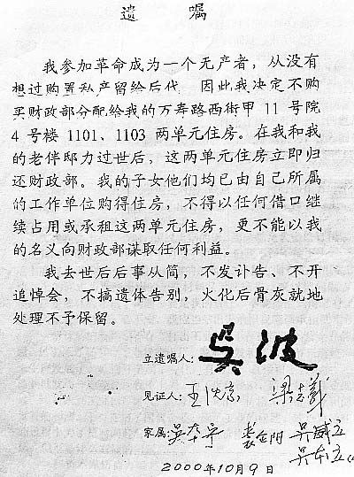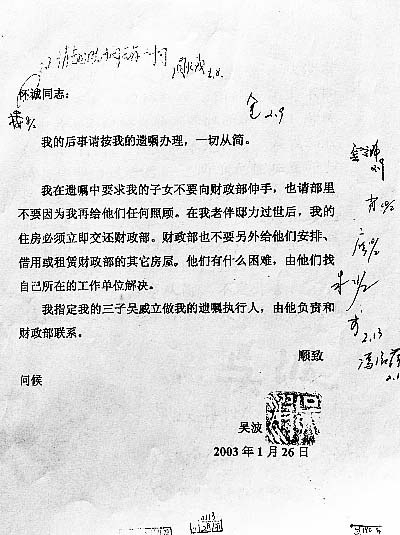 仅举几例:吴老在组织关系中始终坚持原则,不搞拉拉扯扯;绝对实事求是,在任何情况下都不计个人得失,不仅不诿过于人,甚至不惜承揽责任,真正做到了襟怀坦荡、胸无纤尘;对“职权”只视为一种责任,一种担当,一种党和人民赋予的使命,从来未与个人利益挂钩。如有必要,他会不讲任何条件慨然“让贤”,积极推荐年轻有为的同志提前接任;而他还不做“甩手掌柜”,继续做他该做的事。从来不计“名分”,只当了一年部长(正职),不是因为他当不了,更不是因为不让他当,而是他觉得后继的“贤者”早些上马对事业更有利,为此他毕生绝无贪恋权位的记录。只要退了,便与哪怕是象征性的待遇也完全脱离,就连按规定应给原部长留的一间办公室也主动上交,不再保留,真正做到了“一清二白”。然后,彻底回到西城区大酱坊胡同年久失修的旧平房,过他真正的平民生活。几次分新房,单位按规定都分给了他,他都让了出去。他说住原来的平房挺好,地处平民区,能够与老街坊相处,更接地气。直到生命的最后时段,他才不得不接受单位的“硬性”安排,搬到了海淀区万寿路的两个单元的住房。然而,当他生病住院自感不适之时,便毅然决然征得全家同意,将住房如数交还财政部。而且立下遗嘱,以彻底实现“无产者”的夙愿。遗嘱最后曰:“我去世后,后事从简,不发讣告,不开追悼会,不搞遗体告别,火化后就地处理,不予保留。”遗嘱由吴老本人口述,其子吴威立记录。而吴威立和所有的吴老儿孙谁也没沾父亲的点滴“好处”,甚至从未进过他当过部长的财政部大门……林林总总,举不胜举。