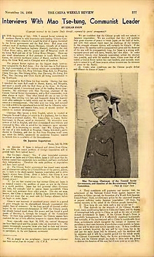 1936年11月,斯诺把自己与毛泽东的谈话全文、对红色根据地的综述寄给了《密勒氏评论报》。报社主编鲍威尔接到文稿后,在11月14日、21日分两期予以全文发表,标题为《与共产党领袖毛泽东的会见》。