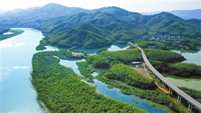 4月22日,赤壁市陆水湖国家湿地公园方世湾大桥段,无人机镜头下的竹海、湿地、村庄构成了一幅生态画卷。