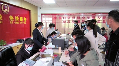 5月20日上午,在通山县民政局婚姻登记处, 工作人员正在忙碌地为新人登记信息、发放结婚证。截至下午13时,为96对情侣办理了婚姻登记,比平时的登记人数高出20倍左右。 通讯员 徐涵 邓阳 摄