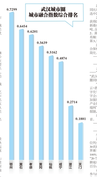 研究发现,八市融入城市圈城市融合指数综合排名为:鄂州、黄石、孝感、黄冈、仙桃、咸宁、潜江、天门。
