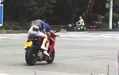 10:18,路口突然响起一阵轰鸣声,一辆车牌鄂L81520的红色摩托车从远处驶来,没有丝毫减速,直直冲过路口。车上,一名着蓝衣的男子带着一女子,均未佩戴头盔。交通劝导员吹响口哨,二人充耳不闻,扬长而去。