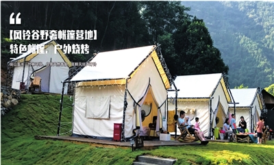 风铃谷集旅游、度假、网红打卡于一体,是综合性的旅游民宿野奢帐篷度假村。景区背山面水、竹林环绕、自带天然香氛,耳畔风铃声叮铃,是以风铃为主题定位于中高端游客的野奢帐篷营地。