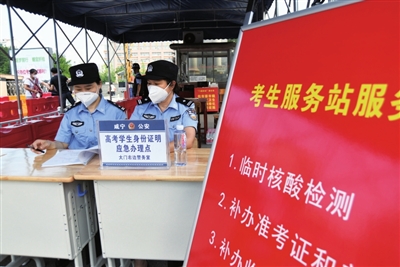 上午8时许,在东方外国语学校考点,一名考生匆忙赶到“办理临时身份证明点”,告诉户籍民警身份证不慎丢失,无法入场考试。了解情况后,现场户籍民警立即启动高考考生身份证补办绿色通道,仅用10分钟就为该考生办理临时身份证明。