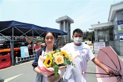 穿着旗袍、手捧一束向日葵的卢女士,想在孩子出考场时第一时间送上写有“高考顺利、加油”寄语的鲜花。她说,“希望孩子一举夺魁,也希望孩子放松心情,迎接之后的考试。”