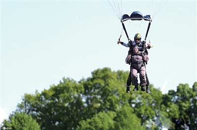 近日,103岁瑞典老人鲁特·拉松与一名跳伞员完成双人高空跳伞,刷新这种跳伞方式的高龄纪录。 (本报综合)