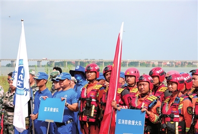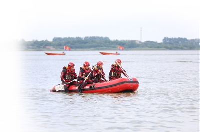 据了解,演练由区直党员突击队、民兵抢险突击队、移动应急保障队、医疗应急保障队、区消防救援大队、区蓝天救援队、区先锋水上救援队等组成防汛应急队伍,围绕转移群众、队形变换、水上救援、堤坝筑防、无人机实时监测、涝水抽排等科目,进行抢险做子堤、船艇编队行进、被困人员转运、“0”型救援、无人机定点空投救生圈、活饵救援、橡皮艇翻覆自救、抛投器抛绳救生、水上机器人救援、溺水人员医疗急救、水下搜救打捞、水上灭火等演练;现场还展示了救生抛投器、水下破拆工具等水域救援装备器材。
