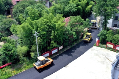 6月8日,赤壁市余家桥乡余家桥村,大型机械正忙着刷黑路面。