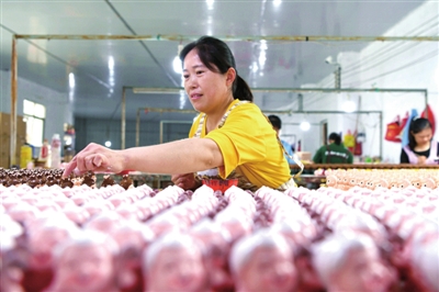 6月9日,通城县大坪乡水口村微工厂,员工忙着生产、包装树脂工艺品,赶制国内外订单。该工厂安排近百名劳动力就业,人均年增收2万元。