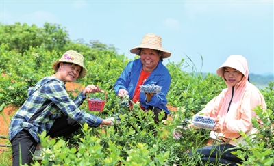 5月24日,嘉鱼县高铁岭镇九龙村,湖北蓝之美农业科技开发有限公司的400亩蓝莓基地,首批20亩大苗已硕果累累,游客已开始采摘。