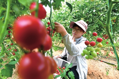 6月6日,赤壁市赤马港街道办事处研学农谷大棚里,管理员正在采摘圣女果。该基地由回乡创业的袁红创建,主要种植圣女果、水果黄瓜、甜瓜、豆角、辣椒等有机精品蔬果1000多亩,俏销周边各大超市和批发市场,年产值300多万元。