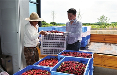 6月14日,位于余家桥乡的湖北大丰收果业发展有限公司杨梅基地,枝头缀满了或鲜红、或紫黑的杨梅。杨梅(露酒)保健酒标准化生产厂房内,制酒工人将一筐筐新鲜杨梅转运到生产线,酿造杨梅酒。