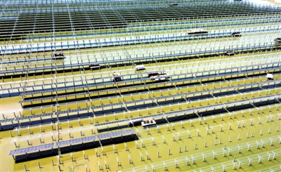 6月17日,赤壁市黄盖湖镇华润·赤壁日曜350MW渔光互补光伏发电项目现场,工人们正在加紧安装光伏板。该项目总投资约20亿元,是华润电力将国家乡村振兴战略与“碳达峰、碳中和”战略深度融合,在“光伏+”领域的全新探索和试点。预计今年10月建成并网发电,年平均发电量4.6亿度。