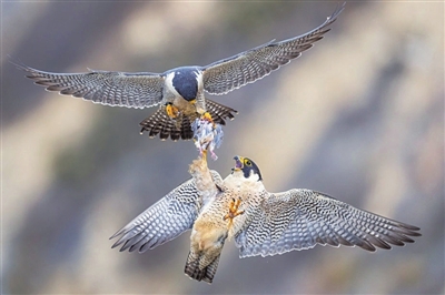 近日,雄游隼与雌游隼相互靠近,雌游隼快速用它锋利的黄色爪子抓住来自雄游隼爪子里的哀鸽。