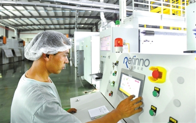 日前,赤壁市车埠镇纺织工业园恒瑞非织造材料有限公司车间,工人正操作机械赶制产品。
