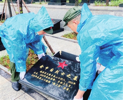 鲜花簇拥下的烈士纪念碑显得格外庄严、肃穆。迁葬仪式结束后,烈士家属及参加仪式代表依次向烈士献花、鞠躬,表达深切悼念和无限敬仰。