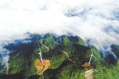 6月28日,重庆,雨后云海环绕黔江区五福岭风电场,美如画卷。近年来,黔江区充分利用高山地区充沛的日照时间,优化能源供结构,打造生态清洁能源,先后在海拔1500多米的麒麟盖和五福岭建起光伏发电站和风电场,助力构建以新能源为主体的新型电力系统,实现绿色低碳发展。