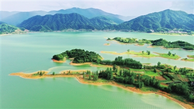 6月30日,鸟瞰通山县富水湖,青山碧水,风景如画。