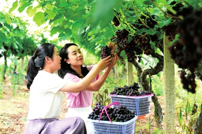8日,嘉鱼县新街镇晒甲山村嘉多宝生态果蔬专业合作社葡萄基地,一串串夏黑葡萄满园飘香,引来游客采摘。