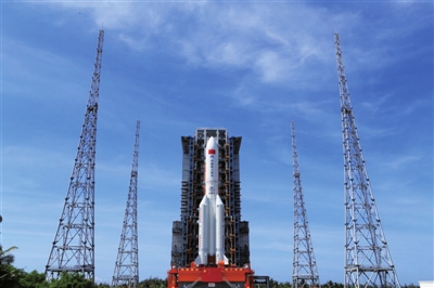 7月18日,问天实验舱与长征五号B遥三运载火箭组合体转运至发射塔架。
