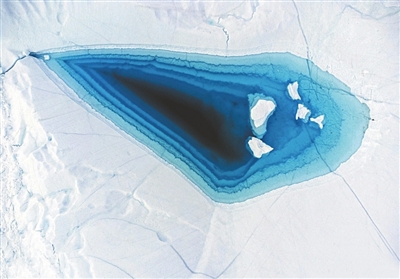 近日,在格陵兰岛西部,伊卢利萨特的迪斯科湾,冰山顶部的一个大融洞中出现了绿松石色的水域。