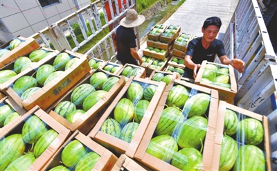 7月20日,赤壁市赤壁镇东柳村创先专业合作社基地,瓜农正在装运西瓜,准备运往长沙。据了解,该基地以“基层党组织+供销社+专业合作社+村级综合服务社”的种植模式,发展高品质西瓜、葡萄和有机大米规模种植。目前,西瓜种植规模达800余亩,每到成熟季,西瓜俏销全国各地,年产值1200多万元。 咸宁日报全媒体记者 夏正锋 摄